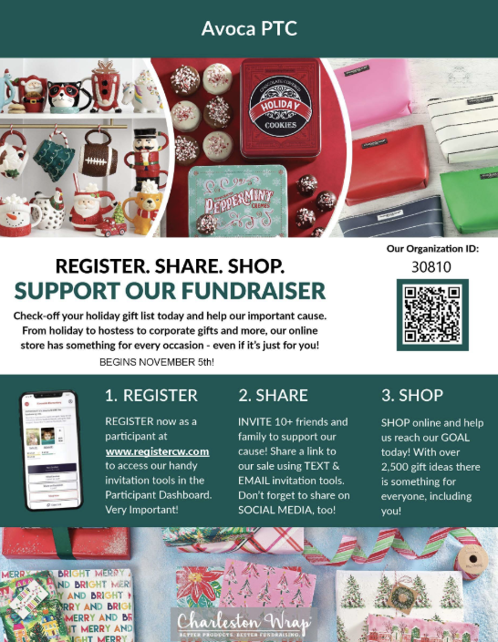 Your student should have come home this week with a detailed instruction sheet on how to register for the PTC Charleston Wrap fundraiser. Our fundraising goal is $30,000. With over 2,500 gift ideas – including holiday, birthday, hostess, and corporate gift ideas – there’s something for everyone. Plus the winning classroom at each school wins a pizza and game party. Register online today at www.registercw.com and help spread the word! Please be sure to add each child's AW Homeroom or MM Advisory Teacher. Share our fundraiser through email, text, and social media with at least 10 friends and family. Remember: sharing is caring!